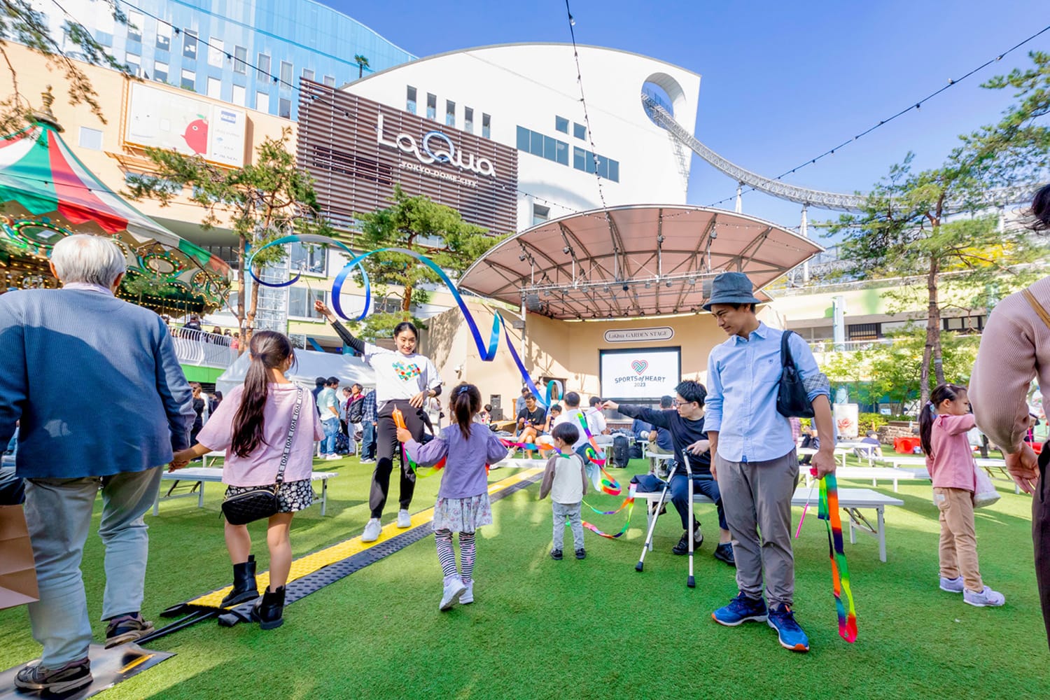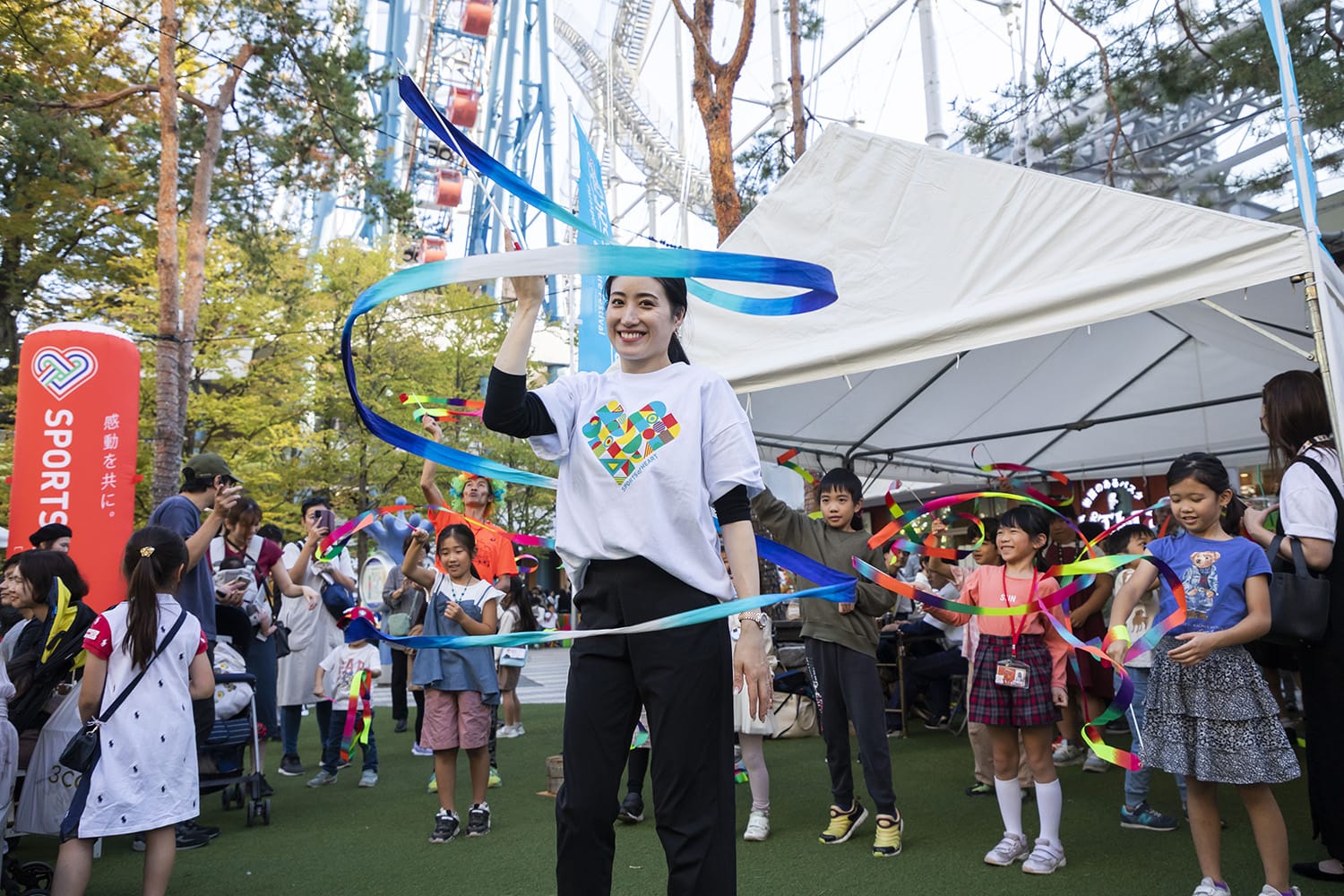 リボンを回したり、弧を描くように投げたりする種目の「リボン」を元オリンピック代表の田中琴乃が競技の魅力をお伝えながら楽しく体験できるブースです。