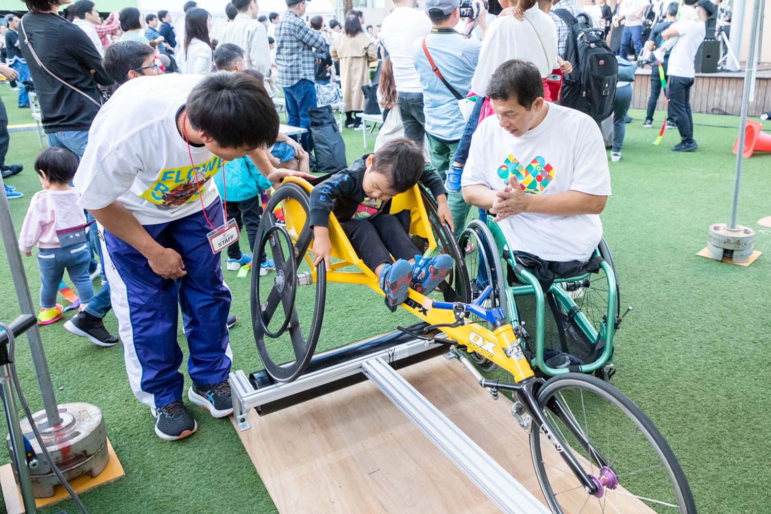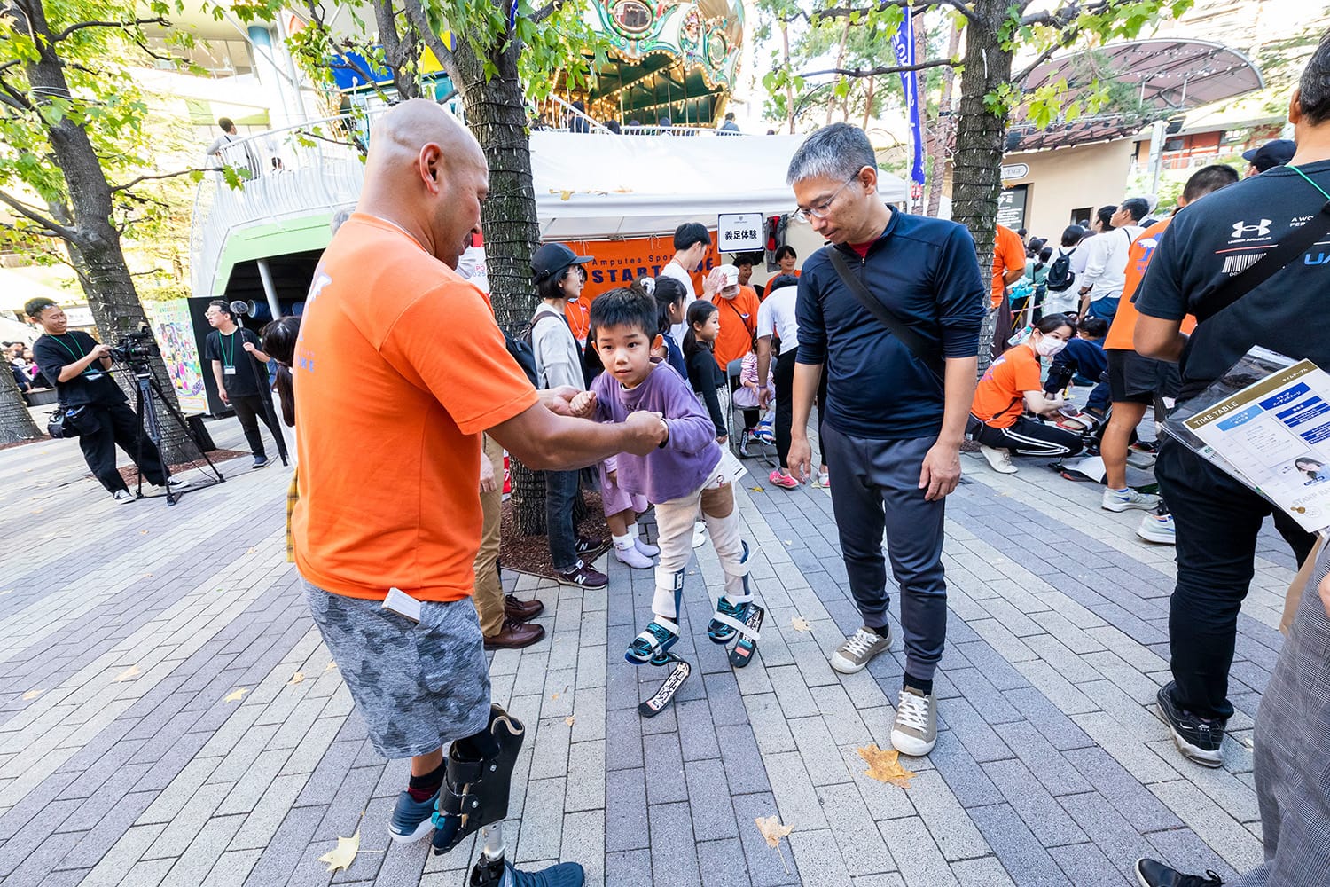 (講師:山本篤)健常者の子どもから大人までが義足の体験ができるブースです。パラ陸上の山本篤選手と一緒に、義足で歩いてみましょう。