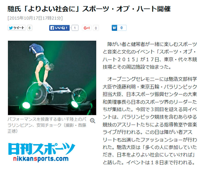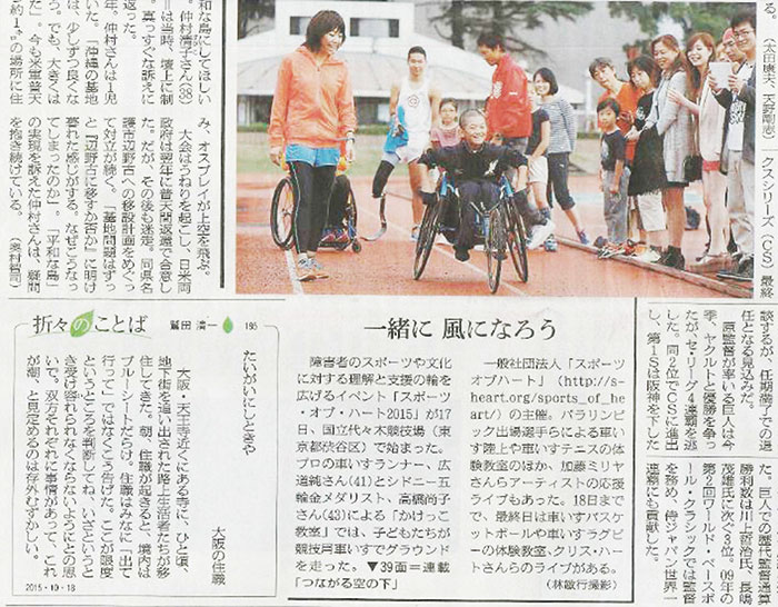 2015年10月17日(土)・18日(日)に、代々木陸上競技場にて第3回目となる「スポーツ・オブ・ハート2015」を開催いたしました。2日間を通して約3万人の方にご来場いただきました。ありがとうございました。障がいのある人ない人が当たり前のように触れ合い分かち合う「未来の豊かな日本」をめざして、スポーツ・オブ・ハートがそのひとつのきっかけになることを願いつつ、ご来場・ご協力いただきましたみなさまに実施のご報告を申し上げます。
