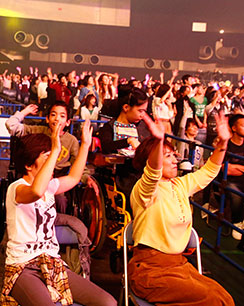 第一体育館のメインステージでは2日間にわたり、スポーツ・オブ・ハートの主旨に賛同する総勢12組の豪華アーティストによる応援ライブが行われました。両日ともにたくさんの観客を動員。熱いパフォーマンスで会場を沸かせてくれました。フィナーレには代表理事の廣道 純が登壇。アーティストのみなさんからスポーツ・オブ・ハートに向けて熱いメッセージをいただき、華やかにライブを締めくくりました。