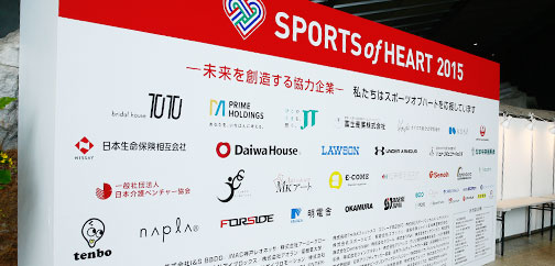 スポーツ・オブ・ハート2015の開催にあたりご協力いただいたパートナー企業のみなさまのブースでは、チャリティーオークションの出品アイテム展示、物販、アート展、足湯などのブースが出揃いました。イベント当日に展示したチャリティーオークションのアイテムは、イベント終了後11/16から「エコオクチャリティ」にて出品をスタートし、たくさんの方に落札いただきました。この落札金はスポーツ・オブ・ハートを通じて障がい者スポーツの発展に役立てられます。