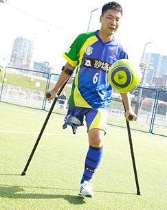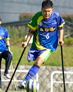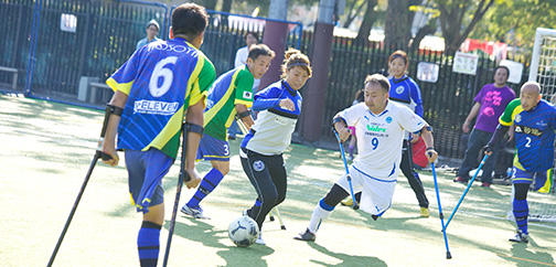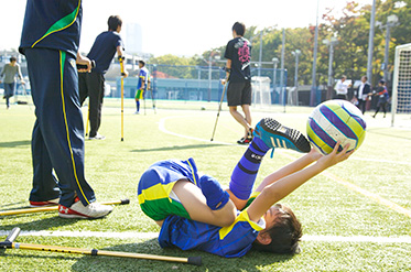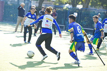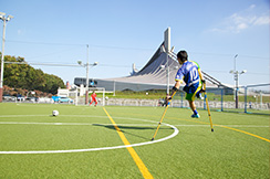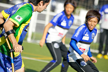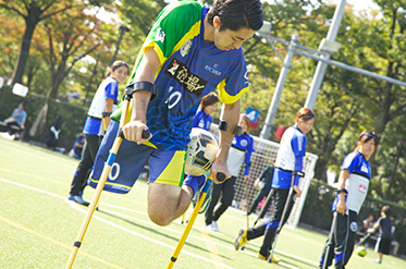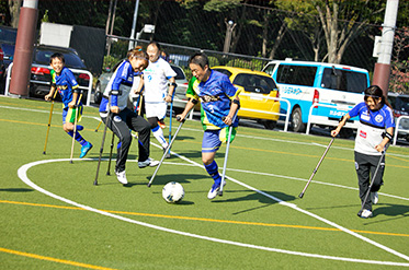 日本アンプティサッカー協会の選手たちによる、アンプティサッカーの体験プログラム。アンプティサッカーはロフストランドクラッチと呼ばれる杖を用いて行うサッカー。主に足に障がいを持つ選手がプレーします。イベント当日は体験会だけでなく、なでしこリーグ2部所属の「スフィーダ世田谷FC」の選手たちとアンプティサッカー選手たちが交流試合を行い、ハンデを感じさせないアンプティサッカーの選手たちの華麗なプレーに会場が沸きました。