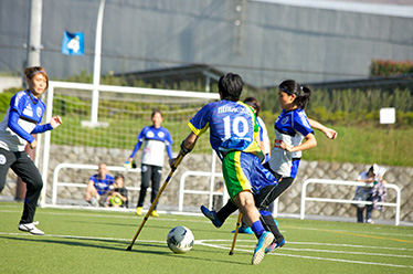 杖を使ってのプレー体験には、現役なでしこの選手たちも悪戦苦闘。 アンプティサッカーがいかに難しいかが伝わってきます。