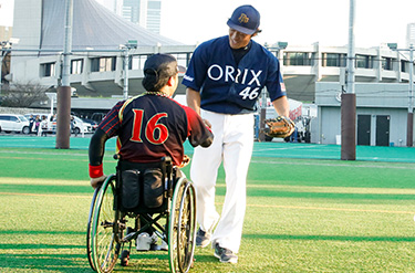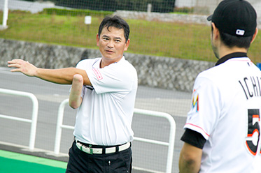 障がい者野球の鈴木雅浩選手も参加、上半身の上手な使い方など普段車イスでプレーするからこそ鍛えられた、「ならではのコツ」を教えていました。