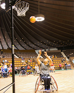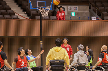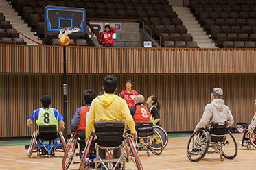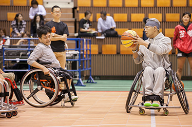 日本車椅子バスケットボール大学連盟のみなさんによる車椅子バスケ体験プログラムには、大人も子どももたくさんの参加者が集まりました。インストラクターを務めたのは、なんと大学のサークルで活動する健常者のプレーヤーたち。車椅子バスケットボールは今や障がい者スポーツの枠を超えて、健常者の間にも広まってきています。ウォーミングアップから簡単なシュート練習、ミニゲームまでを体験。