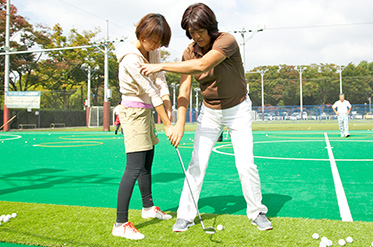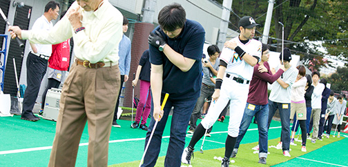 独自のメソッドで有名なティーチングプロの佐久間馨さんによるゴルフレッスンプログラム。障がい者ゴルファーでティーチングプロの資格を持つ小山田雅人さんも駆けつけレッスンをしてくれました。小山田さんは右腕切断の障がいがあり左腕だけでプレーしますが、障がい者ゴルフの日本大会で優勝するなど、その飛距離・スコアは健常者に引けを取りません。参加者は興味津々、真剣に小山田さんの話を聞いていました。