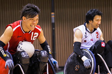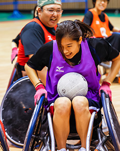 日本ウィルチェアーラグビー連盟の選手たちによるウィルチェアーラグビーの体験プログラム。ウィルチェアーラグビーは、かつてマーダーボール(殺人球技)と呼ばれたこともあるほど激しくぶつかり合う競技。実際に競技用車いすに乗ってぶつかりあってみたり、ボールを持って走らせたり、初めての体験に興奮する姿が見られました。選手たちによるデモンストレーションでは、迫力のプレーが目の前で繰り広げられ、ナイスプレーに歓声があがりました。