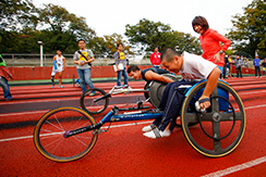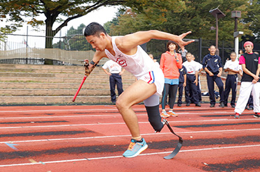 障がいのある人ない人とアスリートたちがみんなで一緒にトラックを走ります。義足のランナーで短距離選手の池田樹生さんは圧巻のスピードを披露。一緒に走った子供たちも驚きと興奮の色が隠せません。