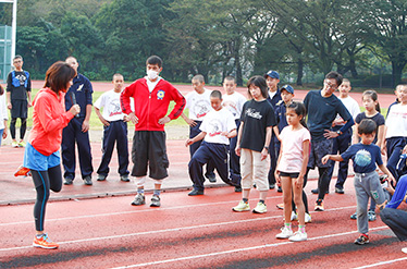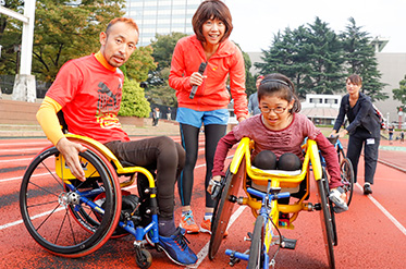 シドニーオリンピック金メダリストの高橋尚子さんによるかけっこ教室は、第1回目から続く人気のプログラム。速く走るためのフォームや気持ちの持ち方など、オリンピック金メダリストから直接教われる機会とあって、子どもたちのみならず大人も含めたくさんの方が参加してくれました。車いすランナーの廣道 純をはじめ、世界の舞台で現役で活躍する陸上の障がい者アスリートたちも参加し、障がい者陸上競技の面白さや魅力を伝えました。