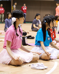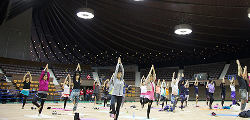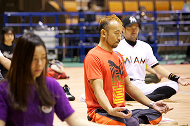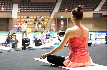 オープニングセレモニーより一足早く実施されたヨガ教室。会場は第二体育館のアリーナ全面を使用。広々のびのびとした空間で、ヨガスクール「ポジティブスターヨガ」協力のもと、初心者の方でも心地よく体験できるレッスンプログラムを実施。癒される心地よい運動とインストラクターの軽快なレクチャーに会場全体が和やかなムードに包まれました。