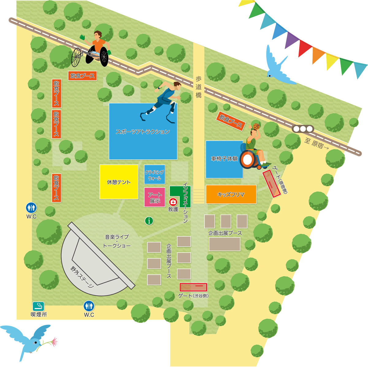 メイン会場のイベント広場は、トークショーやライブをはじめ、ボルダリングや射撃体験などのアトラクションエリアや障がい者アーティストによるアート展示、フードエリア、出展ブースなど、丸一日楽しめる空間です。