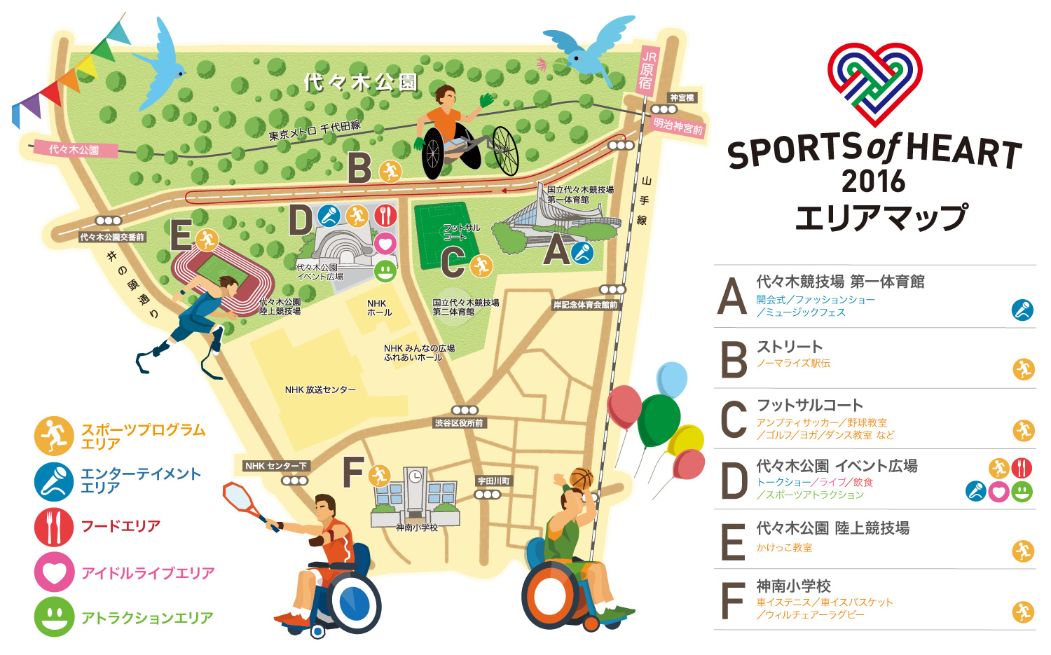 メイン会場となるイベント広場を中心に、障がい者スポーツ体験、音楽ライブ、アートワークショップやパラアスリートによるデモンストレーション、一日中遊べるスポーツアトラクションなど楽しいプログラムが目白押し。