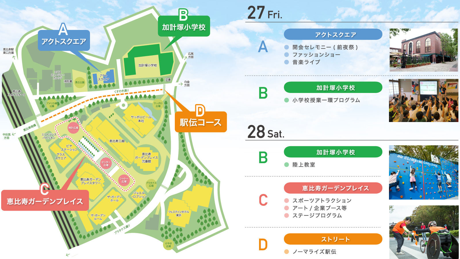 恵比寿ガーデンプレイスを中心に、ノーマライズ駅伝、障がい者スポーツ体験、音楽ライブなどのプログラムが目白押し!