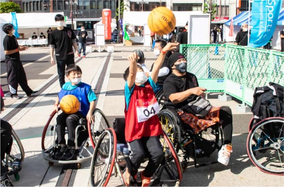 競技用の車いすを巧みに操作しながらプレーするバスケットボール。一緒にフリースロー対決をしてみよう!
